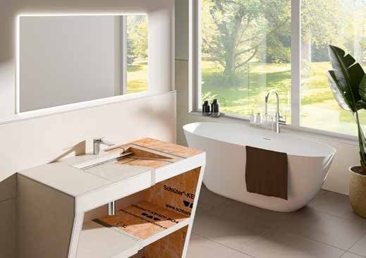 Schlüter-KERDI-BOARD-W to prefabrykowane elementy montażowe do wykonywania umywalek z blatem i dopływem wody poprzez zakupioną osobno baterię do montażu na blacie (Schlüter-KERDI-BOARD-WS) lub na ścianie (Schlüter-KERDI-BOARD-WW). Umywalki wykonane z wielofunkcyjnej płyty służącej jako podłoże do układania płytek Schlüter-KERDI-BOARD mogą zostać bezpośrednio pokryte płytkami metodą cienkowarstwową.